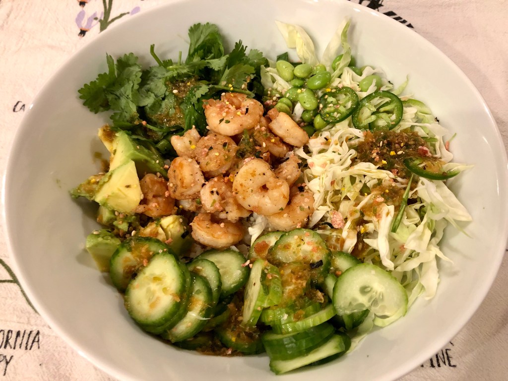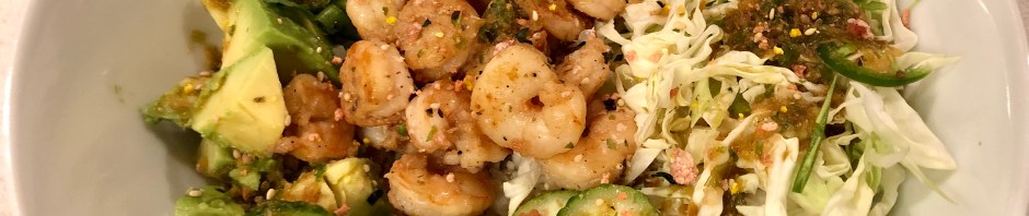 This is our typical Monday dinner, some kind of protein with accompaniments over either rice or riced cauliflower with a sprinkling of jalapeños, scallions, cilantro, and furikake. The standard accompaniments are cucumbers, avocado, edamame and cabbage.