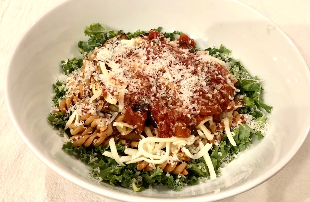 I love eggplant parmesan but I do not love frying eggplant. So to make this healthier dish I cut the eggplant in cubes and sprayed them with olive oil spray and roasted the cubes in a 425F oven for 25 minutes. I also made tomato sauce with a large can of fire-roasted tomatoes, tomato paste, olive oil, onions, garlic, dried oregano and pepper flakes but you can just use your favorite jarred sauce if you want. To assemble the dish I placed some kale on the bottom of my bowl, followed by fusilli that I had finished in the sauce, then the eggplant cubes, some shredded mozzarella, more tomato sauce, and grated parmesan cheese on top.