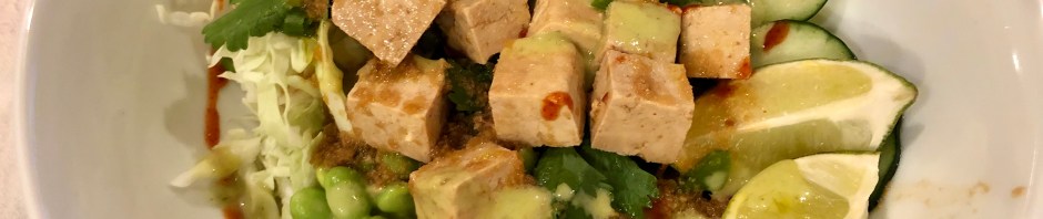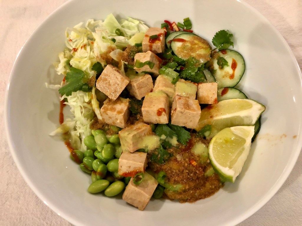 The avocado finally ripened and we dined on my favorite bowl of our three, the marinated tofu bowl. This is another almost no-cook dinner. I heated up my cauliflower rice in the microwave but if you prefer actual rice you would have to cook it.