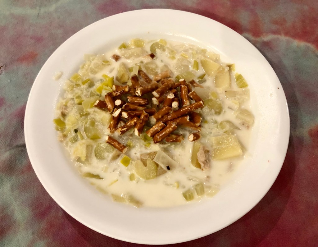 I garnished my bowl with broken up pretzel sticks because someone ate up the oyster crackers. Actually they were quite good on top. They did not get mushy fast and added a nice pop of saltiness.