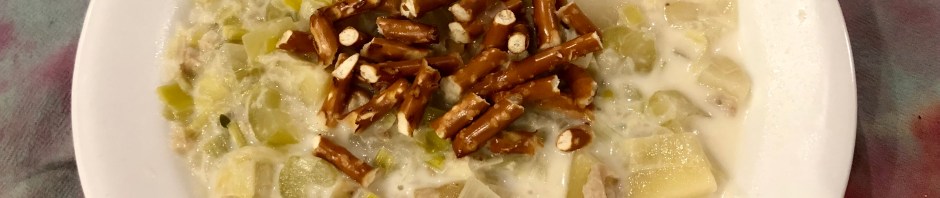 I garnished my bowl with broken up pretzel sticks because someone ate up the oyster crackers. Actually they were quite good on top. They did not get mushy fast and added a nice pop of saltiness.