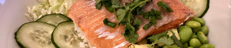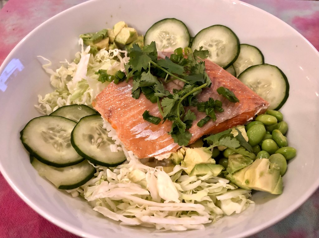 This bowl is a family favorite and we make it three different ways, this one with salmon, another with shrimp, and my favorite with tofu. Other than making rice and cooking the salmon, there is no other cooking involved. I use a small mandolin for slicing the cucumber and cabbage (although you could just buy a bag of shredded cabbage.) The shelled edamame come from a frozen bag. Defrost and salt. One large, ripe avocado is plenty for the three of us.