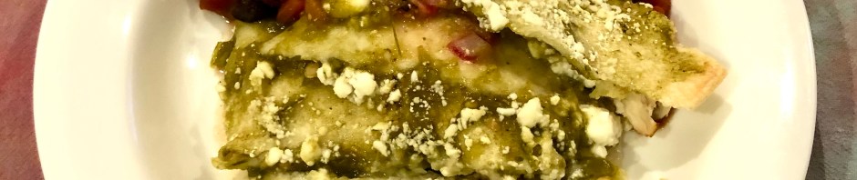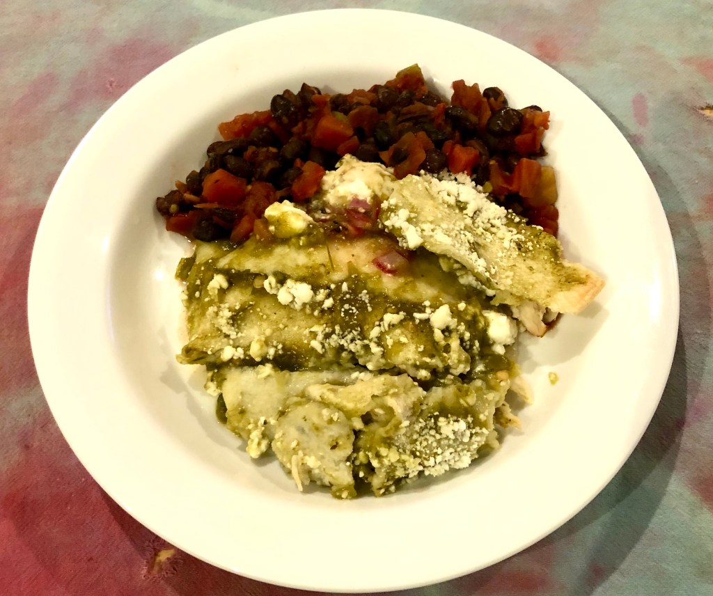 The rolled tortillas were nestled next to each other tightly in a 9×13 dish. The salsa verde covered the bottom of the dish and top of the tortillas. I also sprinkled any remaining cheese on top. It baked at 350F for 1/2 hour.