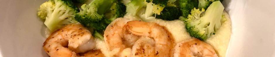 Tonight John took the lead on dinner making both the creamy polenta and the shrimp. I was relegated to broccoli duty. John makes his creamy polenta with a ratio of 1:5.5 or in this case 1/2 cup polenta to 5 1/2 cups of water. It cooks for about 15 minutes and come out really creamy. Once he was ready to cook the seasoned shrimp, I turned on the broccoli which steamed in a little water and 1 teaspoon butter. The polenta was really great with the shrimp and the broccoli.