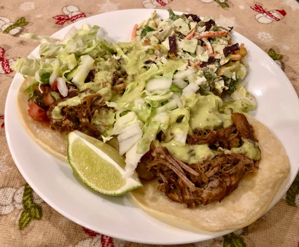I am sure you could do this dish in a slow cooker or in a Dutch oven. It just needs to cook slowly for a long time until it is fork tender. The Instant Pot merely speeded up the process. We really enjoyed our inexpensive Taco Tuesday. We rarely have pork so it was a treat!