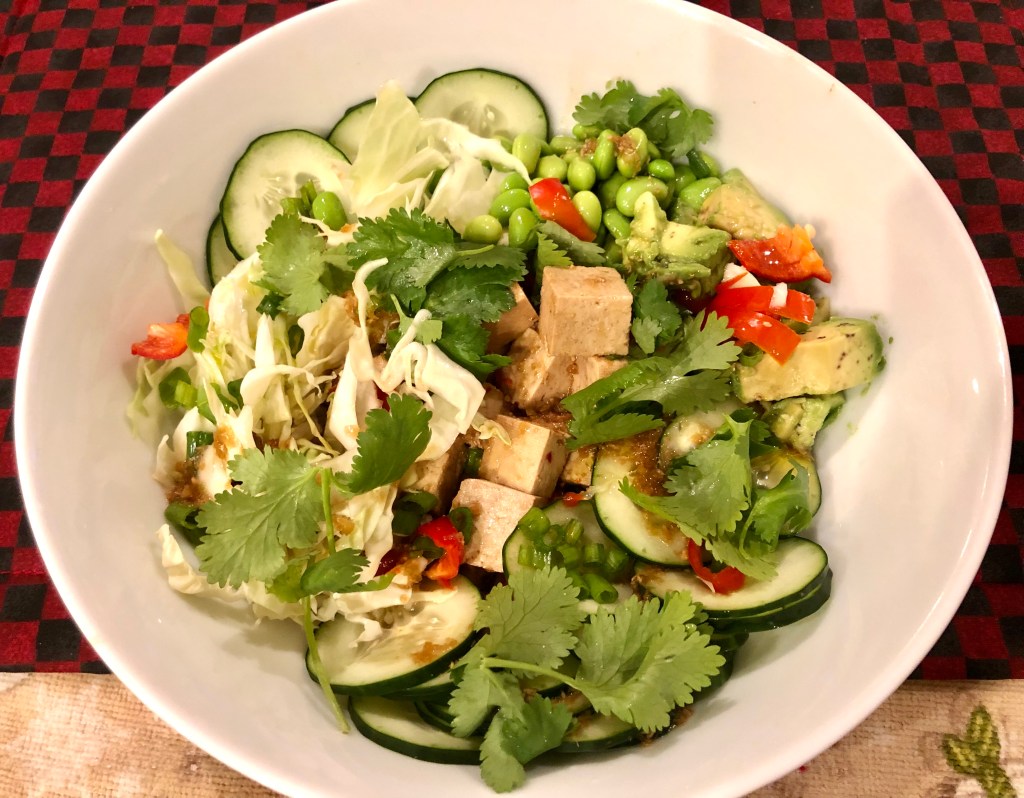 This is my favorite bowl of the three we make. And it is probably the easiest. We get very firm tofu that gets marinated in soy sauce, sesame oil, ginger, and garlic powders and then everything else (except for the rice) is merely cut up. The whole thing is served with a soy vinaigrette. Fast, economical, easy, nutritious, and delicious!
