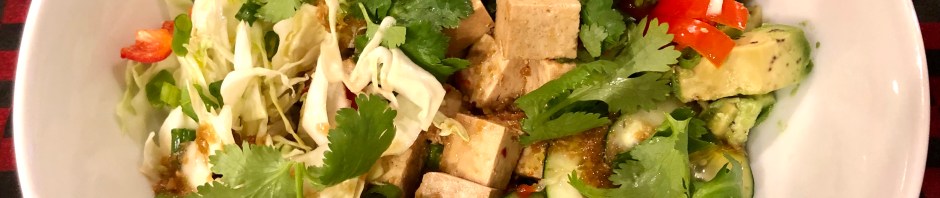 This is my favorite bowl of the three we make. And it is probably the easiest. We get very firm tofu that gets marinated in soy sauce, sesame oil, ginger, and garlic powders and then everything else (except for the rice) is merely cut up. The whole thing is served with a soy vinaigrette. Fast, economical, easy, nutritious, and delicious!