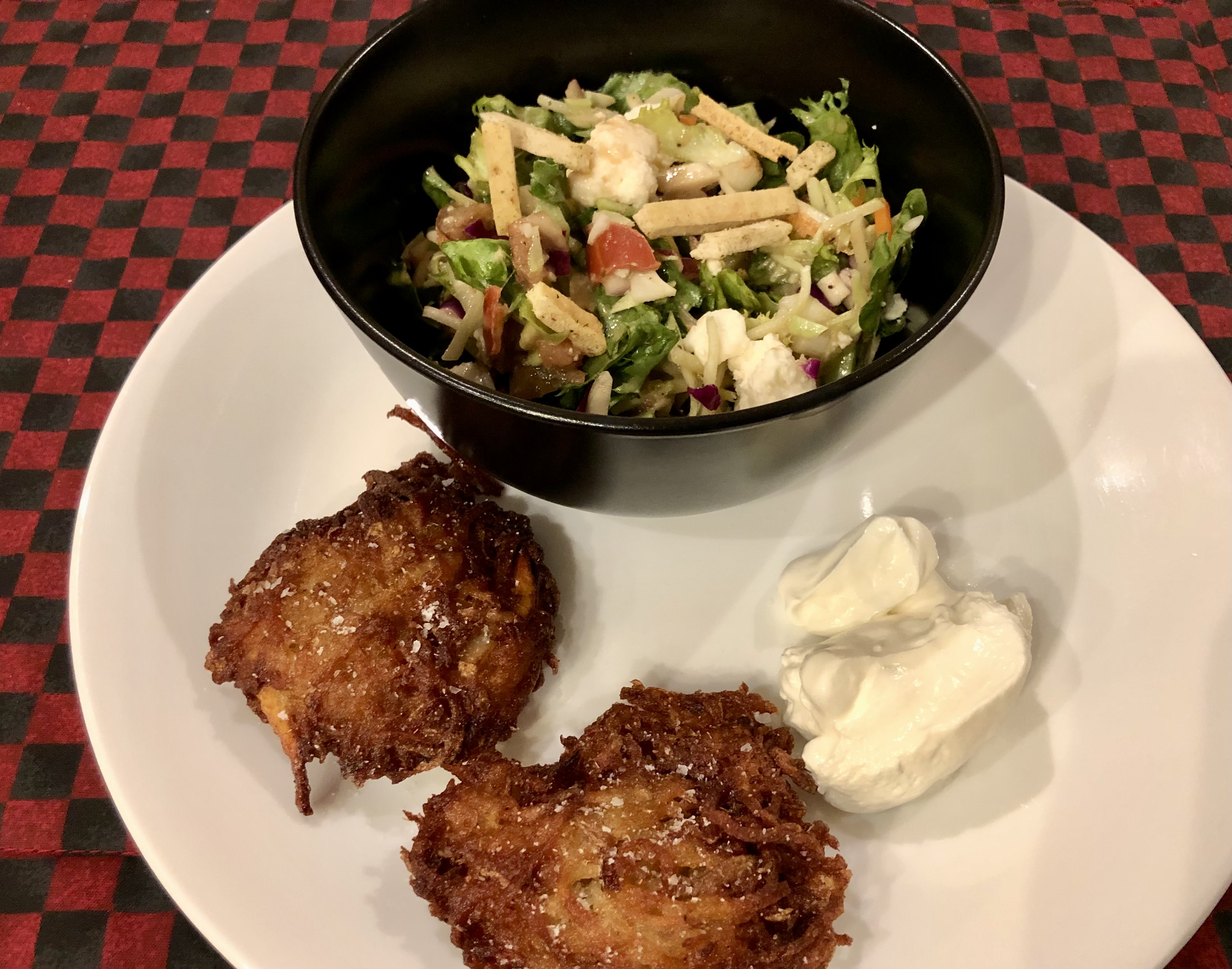 John made a bunch of delicious potato latkes (pancakes) which we served with sour cream and a Mediterranean type salad. Since we rarely fry anything the potato latkes were a real treat. Many people served the pancakes with applesauce but we are definitely a sour cream family.