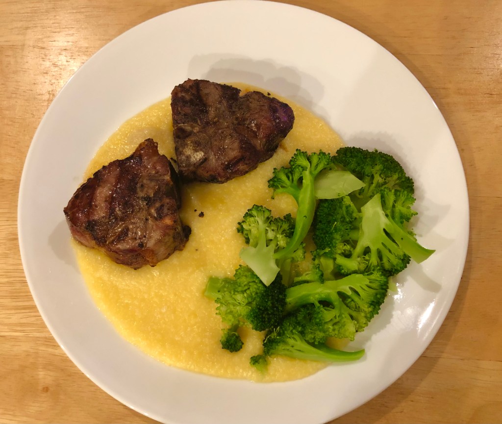 We use Bob’s Red Mill polenta and make it at a ratio of 5.5 liquid to 1 part polenta. Since we were having a splurge night I put a little butter and cheese in it. Normally we just eat it without added fat and it gets flavor from salt, garlic, and bay leaves. Broccoli goes really nicely with the polenta.