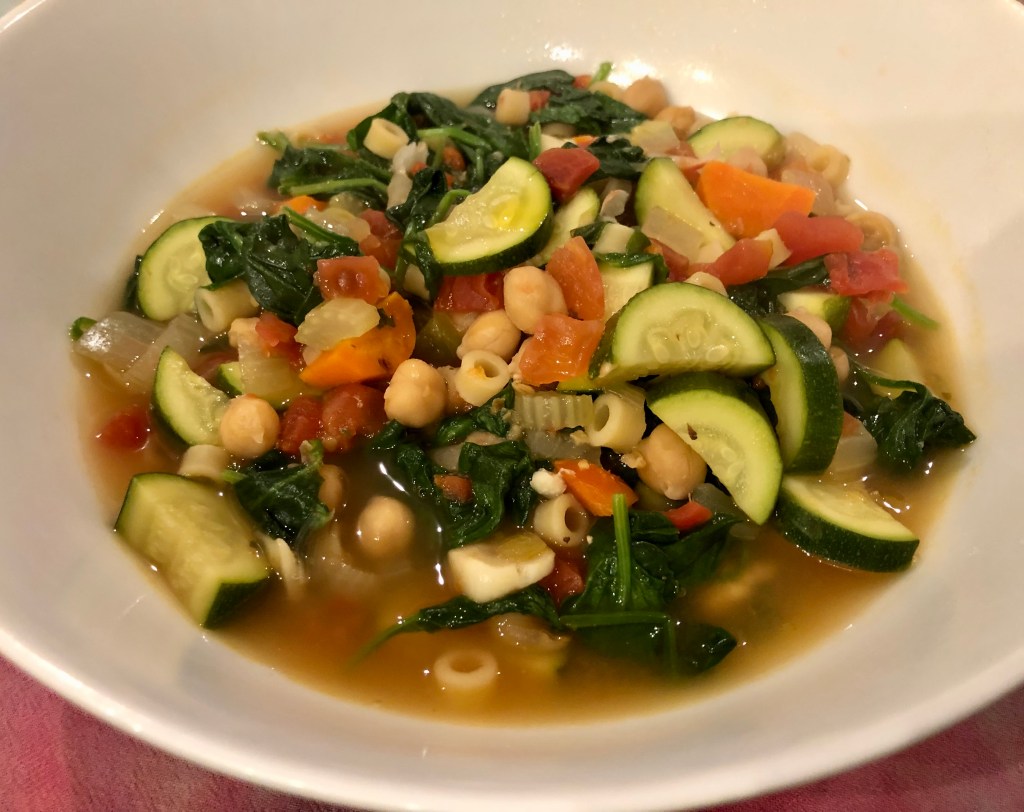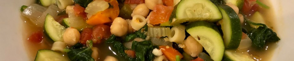 Here’s a big pot of goodness burbling away on my stove top. The main components are chickpeas, some sort of small pasta, and vegetable or chicken stock. After that, use what you have vegetable-wise. I used onions, garlic, zucchini, carrots, celery, and a whole bag of spinach! Along with two cups of broth I added two cups of water, and a can of Rotel spicy tomatoes. If you do not like spiciness you can use regular diced tomatoes. Bring the pot to a boil and simmer until the pasta is cooked through.