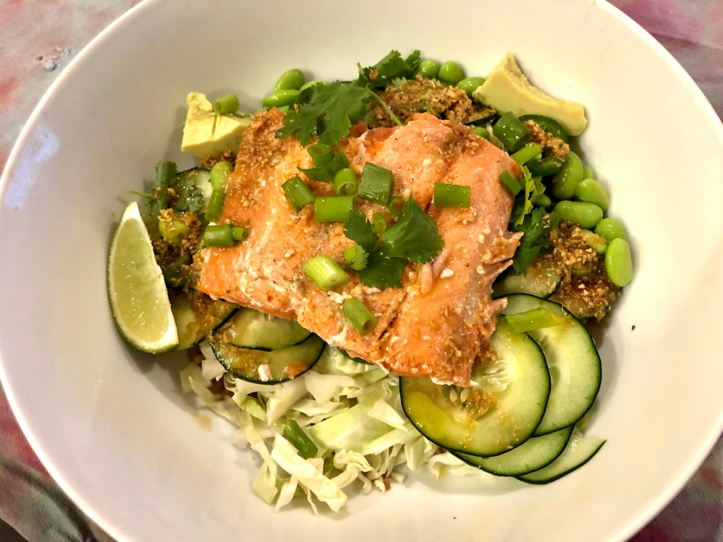 I served my salmon over a riced cauliflower and white rice base. Around the salmon I have shredded cabbage, sliced cucumber, edamame, and avocado. I am also feeling a little annoyed about the avocado which had a big brown spot and was not as bright green as usual. Plus they had gone up to $1.50! The dressing is a mix of soy sauce, rice wine vinegar, garlic, ginger, and green onions. Since we all like a different amount of oil we put our own over top. Garnish with cilantro, lime, and green onions.