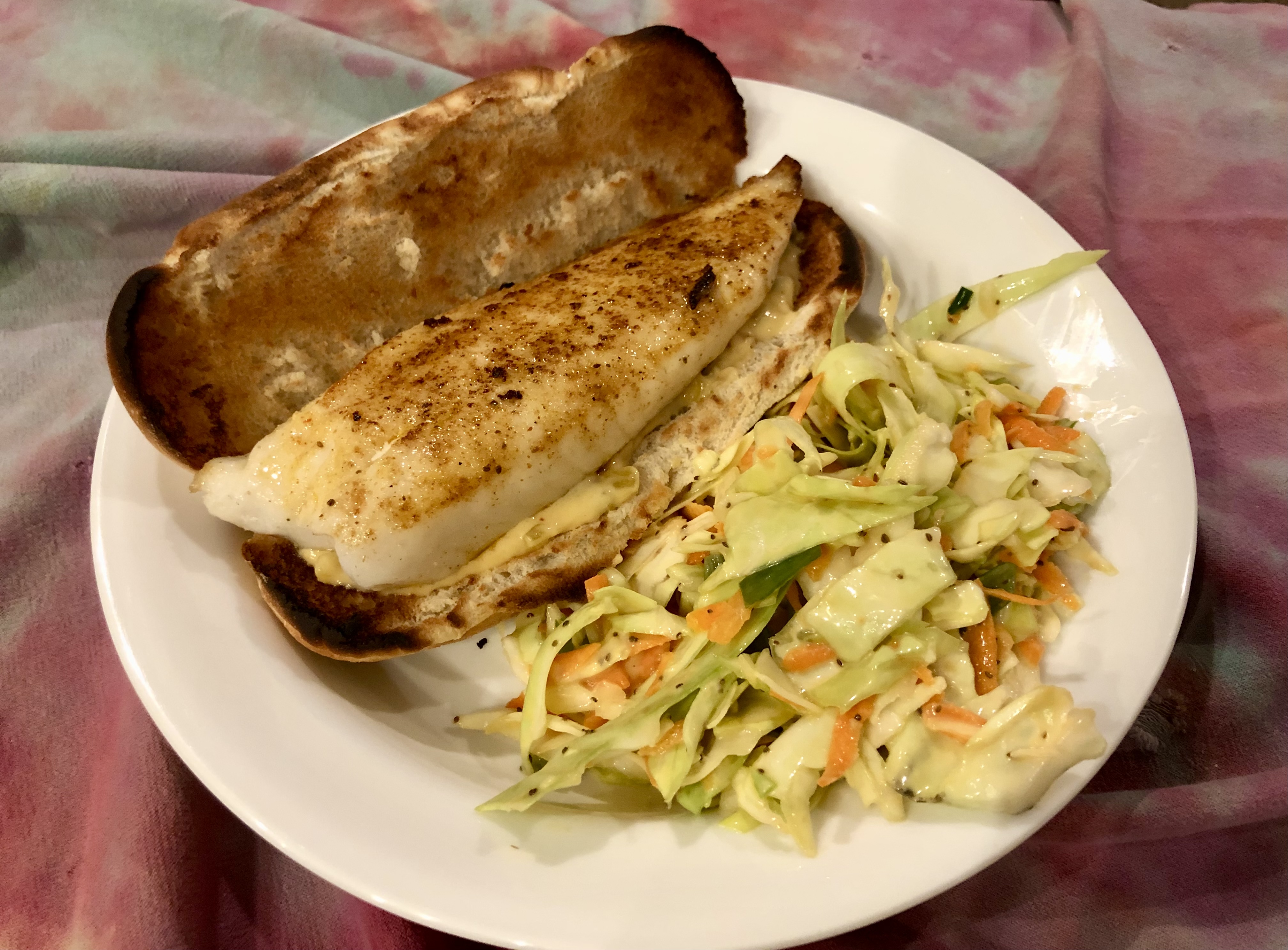 Tonight’s simple dinner satisfied a craving for a sub. John cooked the fish quickly in a pan on the stovetop. I toasted the rolls under the broiler. I also made the coleslaw and some tartar sauce. The tartar sauce is basically mayonnaise, cider vinegar, yellow mustard, and capers. I added a shake of onion and garlic powders and a squirt of sriracha for spice.