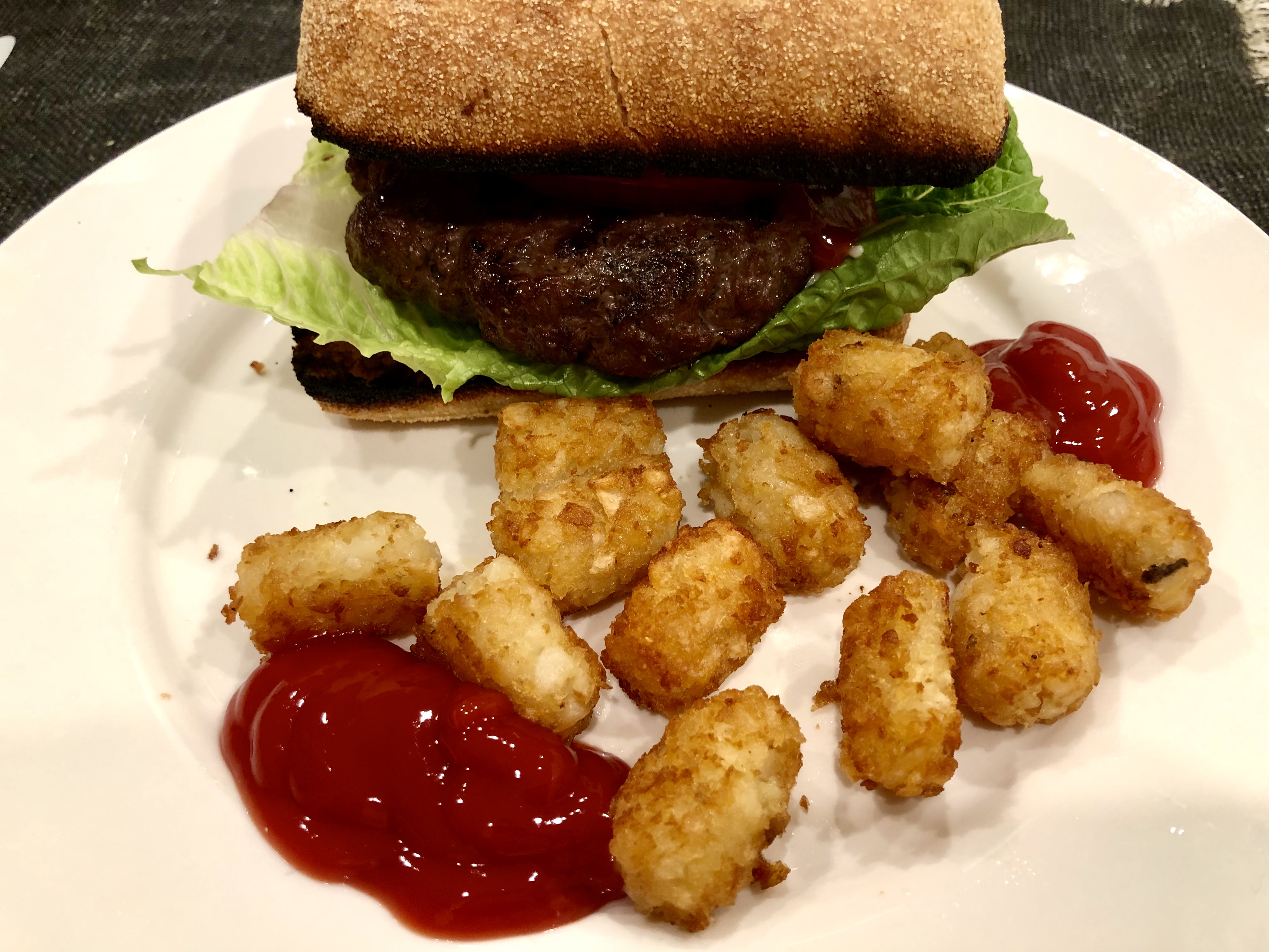 Medium-rare hamburger on a toasted ciabatta bun with lettuce, onion, mayo, and ketchup, yum! I misjudged how long it would take to cook the tater tots so mine had the texture of being microwaved. At least the underdone potatoes kept me from eating too many. I put the rest of them back in the oven so the guys could have crispier ones. John ate the rest of them in an omelet of leftovers this morning.