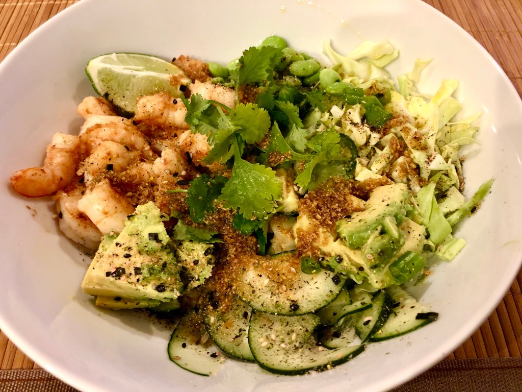 We make three types of bowls, salmon, tofu, and shrimp. We all have our favorite. I think I am going to move my favorite up from 2 to 1, shrimp bowl!