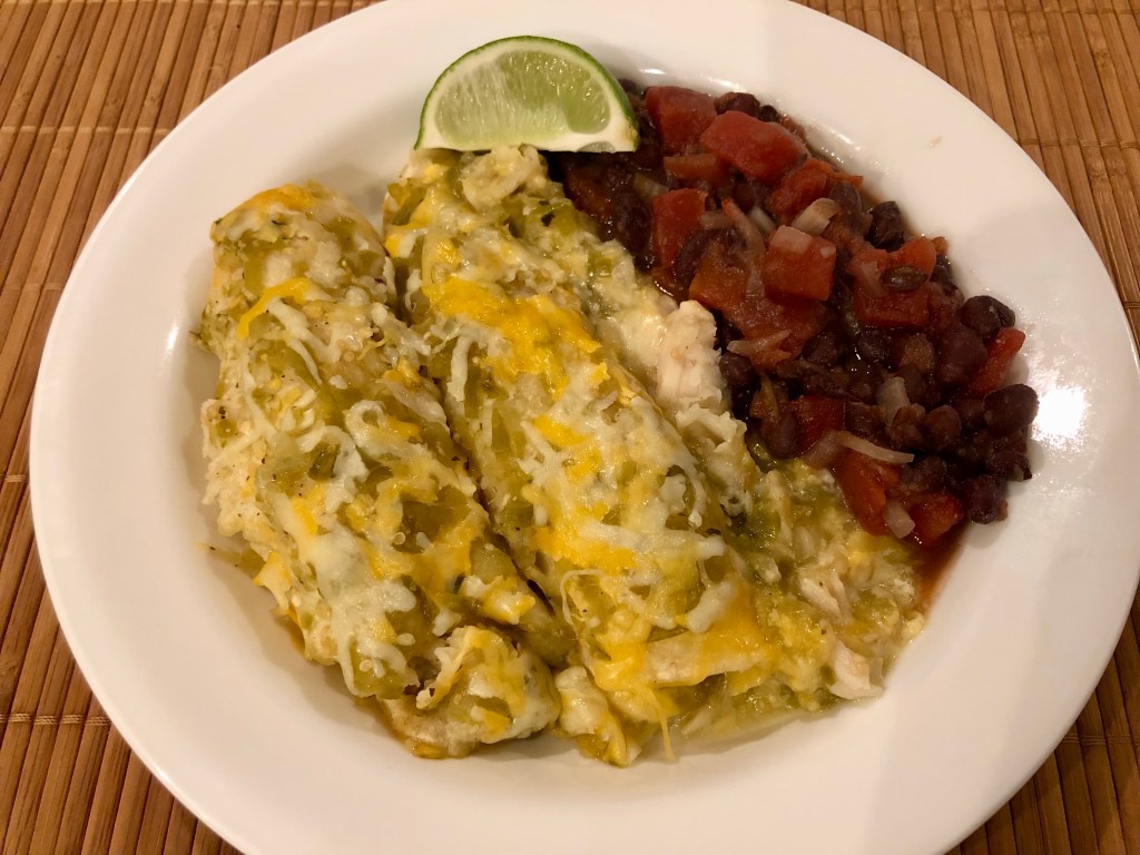 The enchiladas were baked in a 350F oven for 40 minutes. At that point the sauce is bubbly, the cheese is melted, and the enchiladas are cooked through. Along with the Asian bowls we make, enchiladas and tacos always get rave reviews at our house.