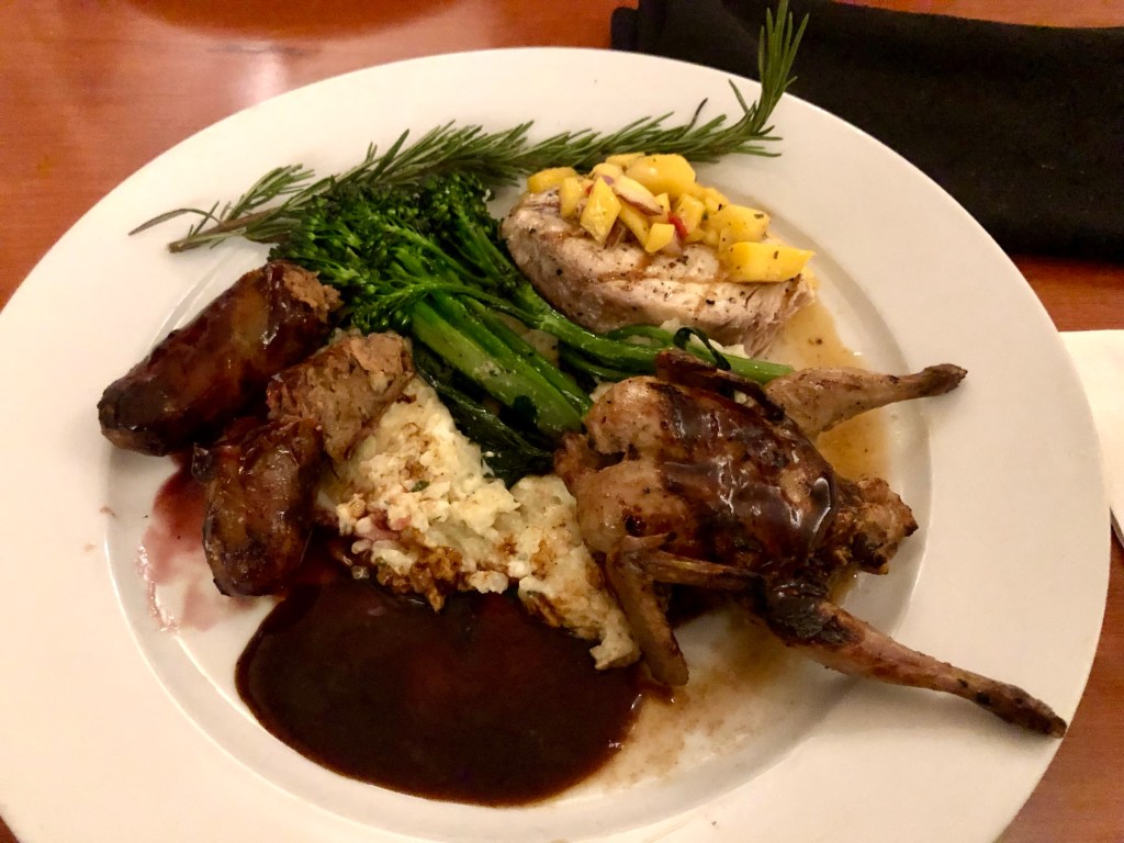 This dish just has too many components so it was hard to get them all right. The elk sausage was very good but the quail and swordfish could have used a lot more seasoning. The risotto was a clump of rice. So the dish was not entirely successful. I ate some of it.