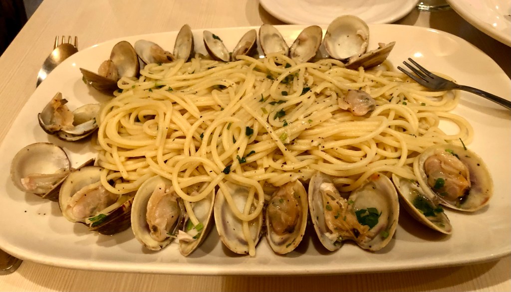 It was an enormous plate of food! I ate a little of the spaghetti and all of the clams. We took the rest of our dinners back to the hotel and ate them for dinner on Monday. The original portion was so large that we still had to throw some of it away. I am looking forward to eating spaghetti alle vongole in Italy next month!