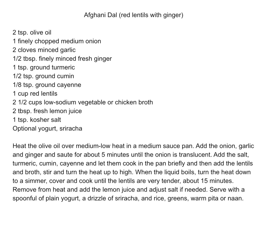 Red lentils turn bright yellow when you cook them. They are quicker cooking than brown lentils and really take on the flavors of the spices. They also tend to break down a little. In Wednesday’s quick and easy vegan dish we added chopped collard green stems while the lentils were cooking. I made a chiffonade of the collard leaves and served them raw under the lentils. The greens were dressed with a little olive oil and seasoned with salt. For a heartier dish serve the lentils over rice.