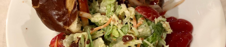 John did his usual great job grilling the hamburgers. I added a slice of onion, some lettuce and tomato on mine along with ketchup on top and mayo on the bottom. This is the first time using pretzel rolls and the verdict was six thumbs up. I ate my burger with a knife and fork. It was just too slippery to try to hold it in my hand and it would have been gone too fast! Eating finger or hand-held food with a knife and fork is a great diet tip. If you slow down your eating, you will notice that you are getting full and maybe do not need to vacuum up everything on your plate. I often use this technique with tacos. Two open faced tacos are way more filling than two hand-held ones!