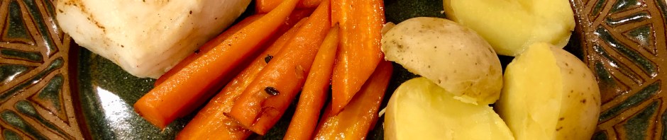 For my part I steamed new potatoes and glazed some carrots. The potatoes were bigger than usual and took about 25 minutes. I had to add additional water to keep the pan from drying out. The carrots cooked in a little water with a tablespoon of sherry vinegar for fifteen minutes. I took them out of the pan, dumped out the remaining water and made a glaze. This consisted of another tablespoon of sherry vinegar, some minced onion, thyme leaves and a tablespoon of brown sugar. Then I returned the carrots to the pan to glaze them.