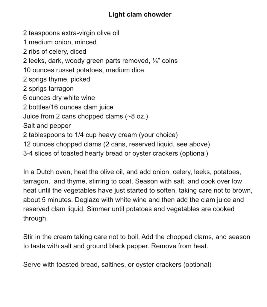 How can you make a creamy clam chowder light? I use only 1/4 cup of cream which works out to be about 1 tablespoon per person and I add russet potatoes instead of waxy ones. Russet potatoes break down slightly in the soup giving it a creamier texture.