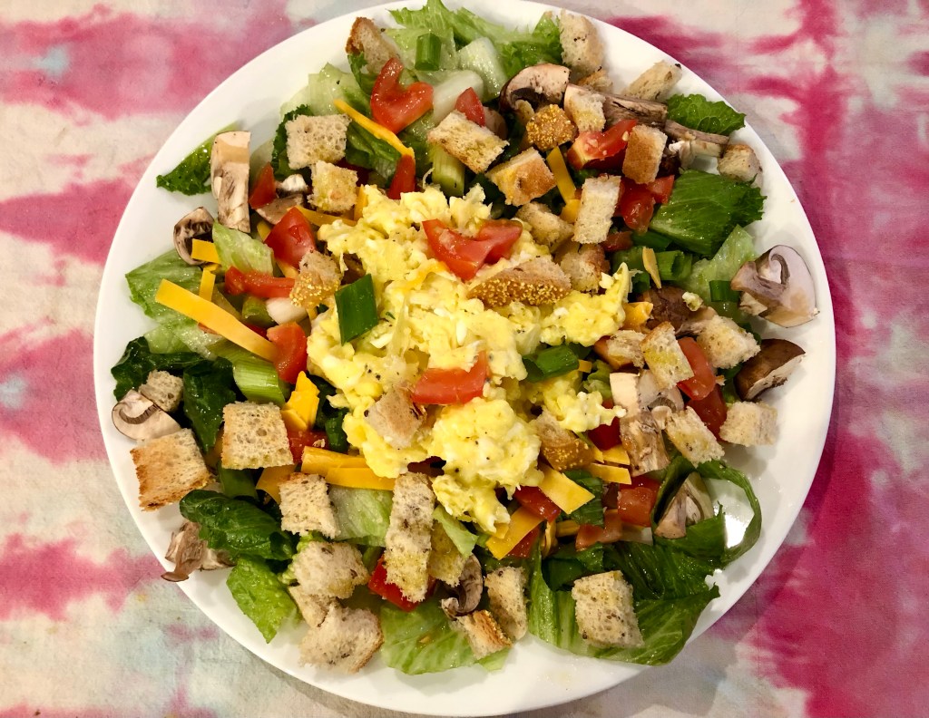 Sunday is almost always make-your-own-egg dinner. John always makes a ham, scallion, mushroom, and cheese omelette. I make something different each week. This week I made a salad of lettuce, tomatoes, cheese, mushrooms, scallions, and croutons then topped it with scrambled eggs. The dressing was simply oil, vinegar, salt, and pepper. It was delicious!