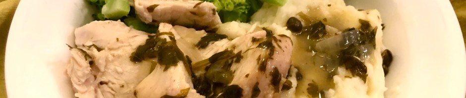 Here is another use for rotisserie chicken. On Monday, our traditional chicken day, we made a piccata sauce for one of the breasts from our rotisserie chicken. Since we were merely reheating our chicken, we used the powder from a packet of chicken gravy to make a roux with butter and then added white wine, lemon juice, capers, and parsley to it and used the stock that I made earlier in the day to give volume to the sauce. After bringing it up to a boil and lowering the heat we gently warmed the meat.