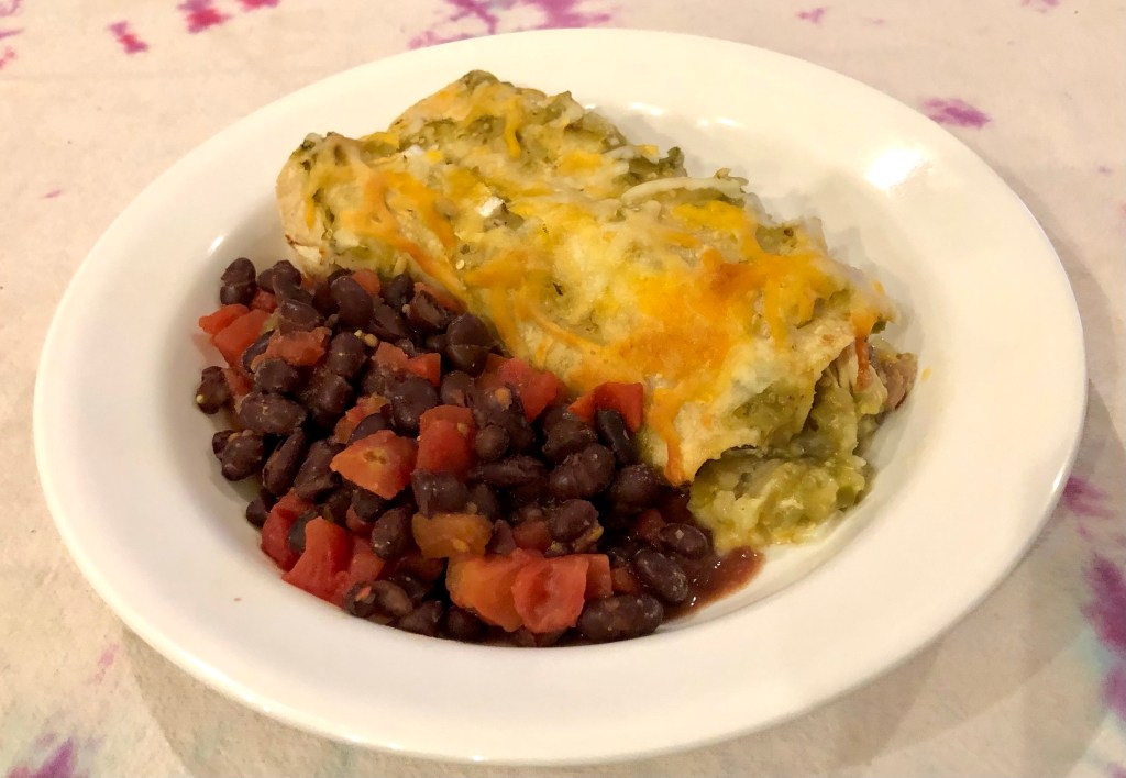 Our main course was chicken enchiladas which consist of shredded rotisserie chicken, shredded cheese, chopped onions, and salsa verde rolled in a corn tortilla.