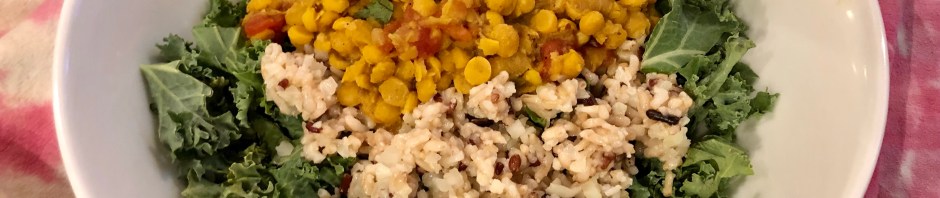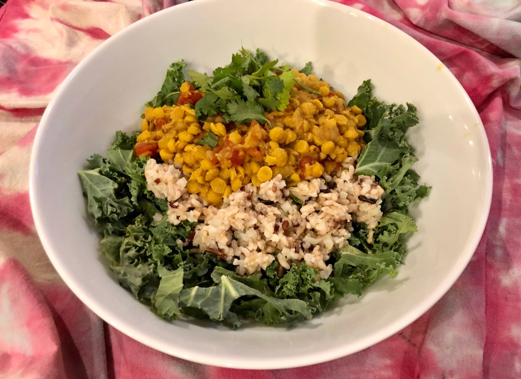 Along with the Chana dal I made my usual rice mixture of hearty rices cut with riced cauliflower. On the bottom of the bowl is a layer of Foster Farms triple washed, chopped kale.