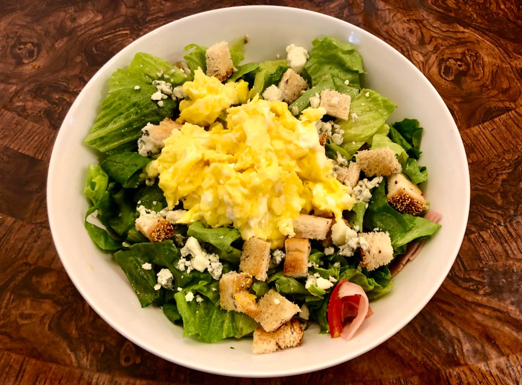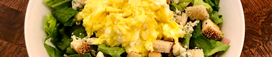 Although you cannot see them in the picture my dinner salad is full of tasty tidbits. Hiding under the lettuce and scrambled egg are tomatoes, mushrooms, green onions, ham strips, croutons, Gorgonzola crumbles, and a drizzle of olive oil and a splash of rice wine vinegar. This was so good that I may make another one for lunch tomorrow!