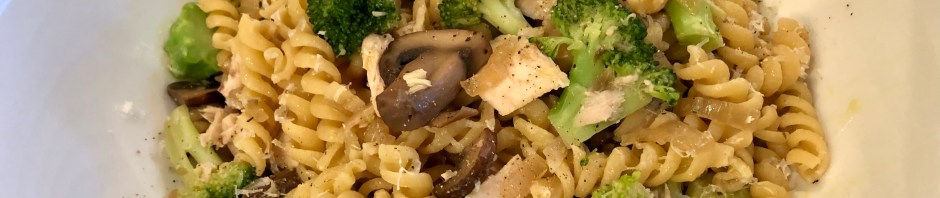 We made this dinner from ingredients we always have on hand—pasta, a can of tuna, mushrooms, broccoli, onion, garlic, and parmesan cheese. John is in charge of making the pasta and I take care of everything else.