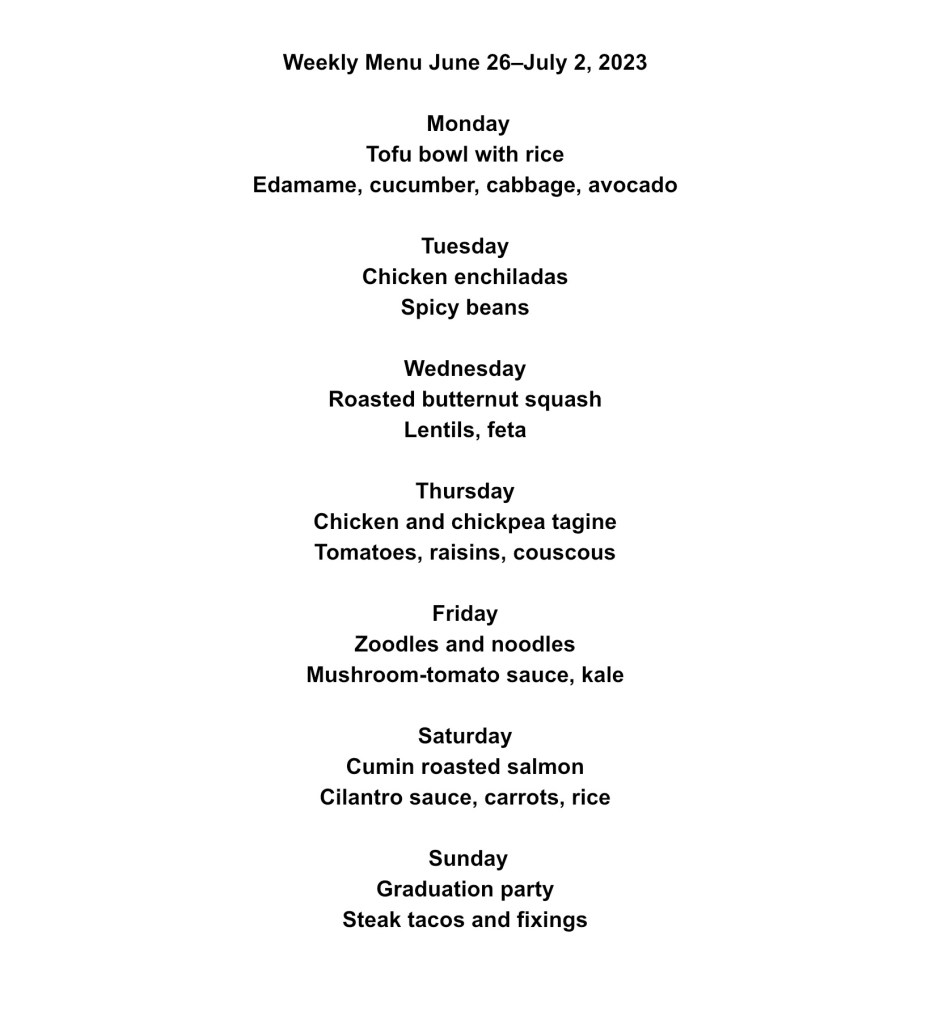 We are starting off our healthy eating regime this week with three vegan/vegetarian meals, two chicken meals, one fish meal, and a party meat meal. (Steak tacos because that is what our grandson requested!) The tagine, roasted butternut squash with lentils, and the cumin roasted salmon are all dishes we have never made before so that will be exciting!