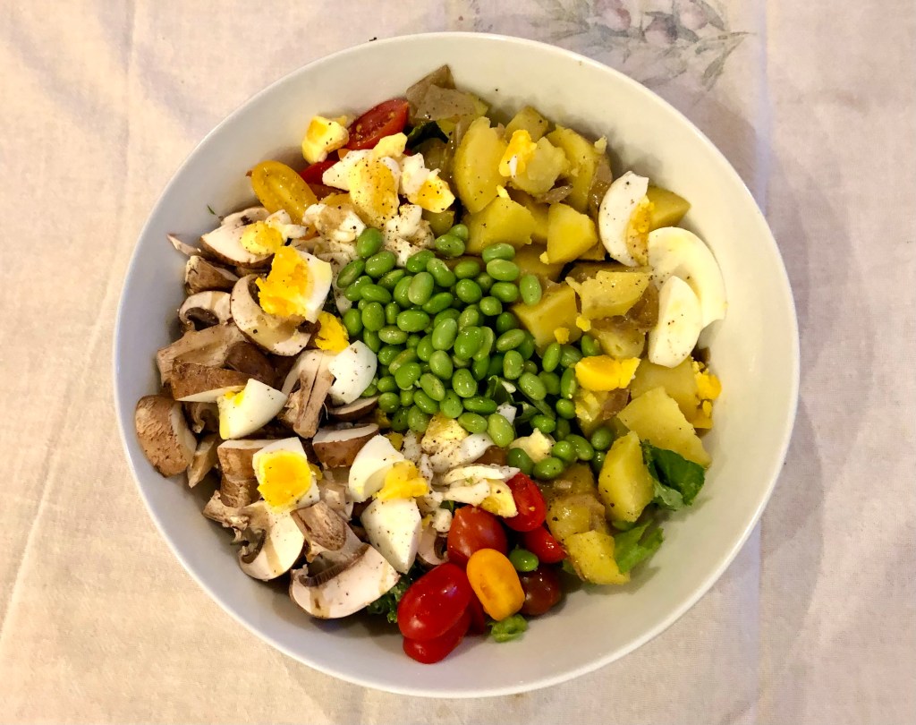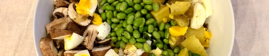 On Sundays we almost always have some sort of eggs for dinner. In fact we call it Breakfast for Dinner. This Sunday I made sort of Lunch for Dinner but still incorporated eggs. My dinner salad was a lot like a Niçoise salad except without the tuna and edamame standing in for green beans.