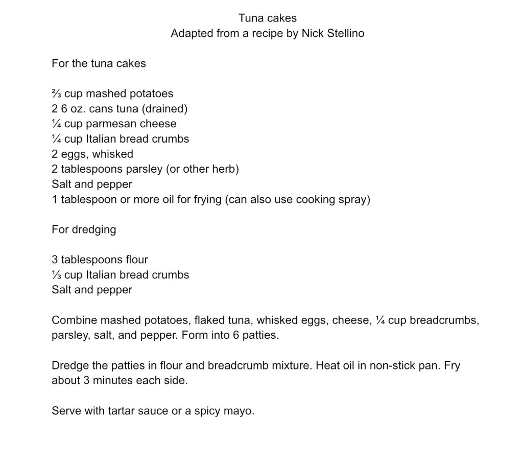 I have included the “sort of“ recipe I have. For the six tuna cakes we made we had more mashed potatoes (at least a cup) and less tuna (1-7 ounce can.) We also used some shredded Mexican blend cheese that was on hand instead of Parmesan and basil instead of parsley. Our tuna cakes were probably a little more potato-y but that was fine. The recipe is pretty forgiving.