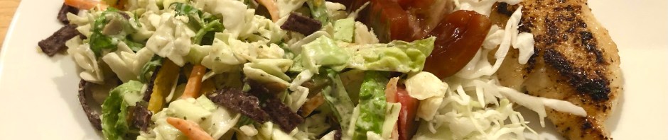 We have a couple of hot days this week so quick cooking fish fillets and salads are the way to go. John cooked up the fish and I just laid mine on a white corn tortilla piling the taco accoutrements of shredded cabbage, chopped tomatoes, and guacamole around it. A salad completed the dinner.