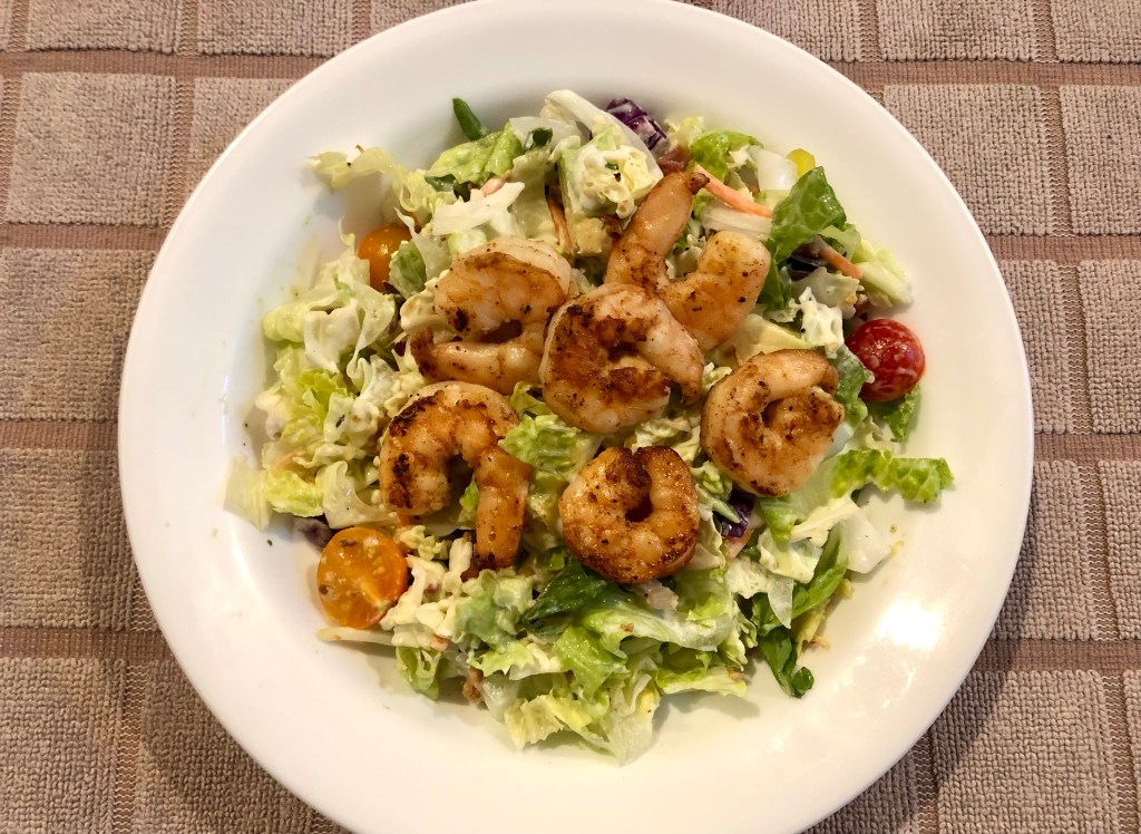 On Saturday we were supposed to be making cheese-y polenta with saucy beans. However, John defrosted some shrimp thinking our dish was shrimp with polenta and broccoli. So we changed plans and made a packaged salad that I needed to use before it started to turn brown, added chunks of avocado, cherry tomatoes from our daughters garden, and put the sautéed shrimp on top. It was a lovely light meal.
