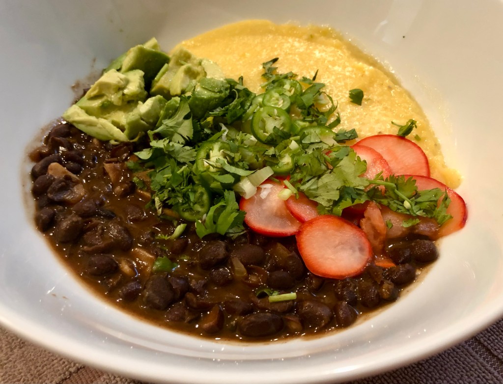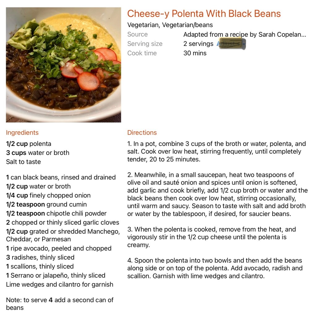 John and I made this new recipe for polenta and black beans and it was super yummy! John made his creamy polenta and I was in charge of jazzing up the beans. Between the Serrano chile and the chipotle chili powder the final dish had quite a zing to it. I adapted the recipe to fit our profile of spice level and healthy eating and have included it below. If you want to make it for 4 just add another can of beans. For a vegan version use a sharp vegan cheese.