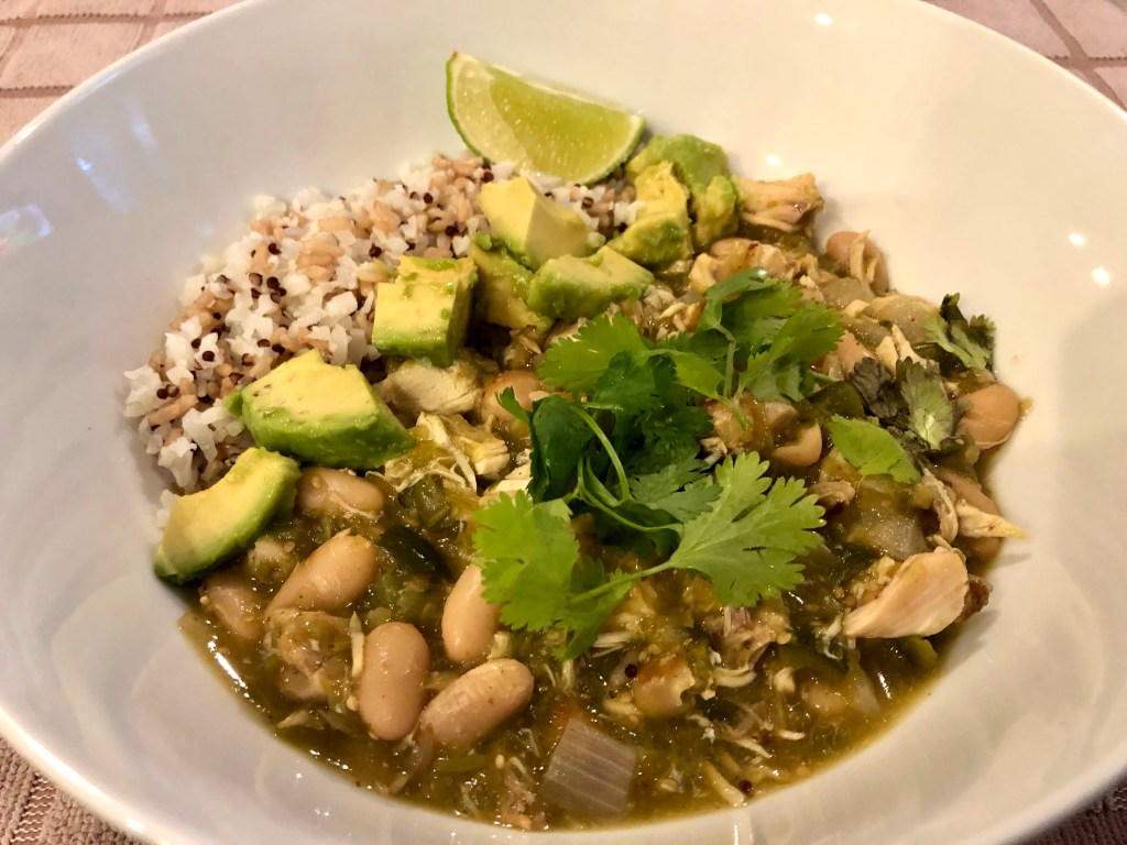 I put 2 ladlesful of the chili on one side of my bowl and added a combination of brown rice, quinoa, and riced cauliflower on the other. My dinner was garnished with cilantro, avocado, and a lime wedge. It was so good and filling that I forgot to make the salad that I was planning on! Plus, we have leftovers for lunch!!