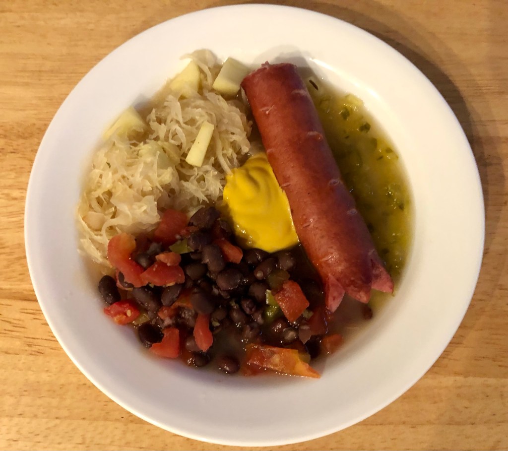 We were supposed to be having tofu bowls tonight but our avocado did not ripen fast enough. So I cast about the kitchen trying to devise a new dinner plan when John suggested turkey sausage. I had bought a couple of cans of sauerkraut and we always have beans on hand so it seemed like a plan.