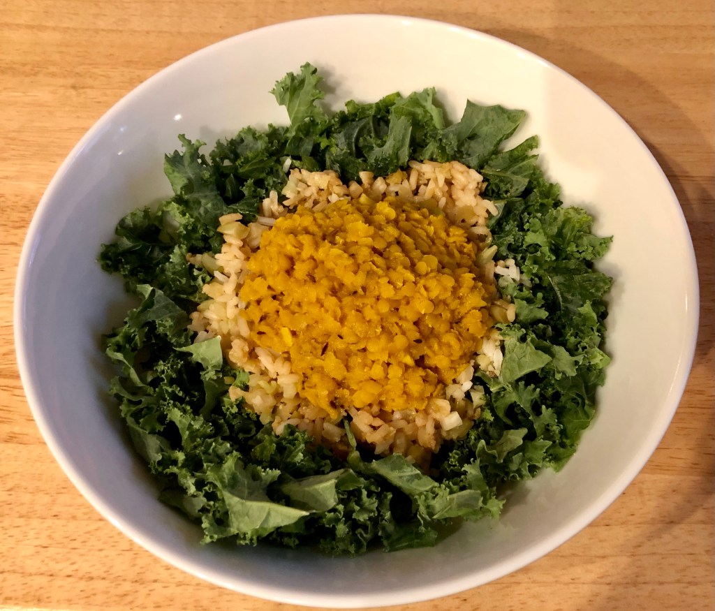 Red lentils are quick cooking so the dish is ready in about 15 minutes. We serve ours with kale in the bottom of the bowl, then rice or in my case a rice and riced cauliflower mix, and then the lentils. Garnish with a squeeze of lemon and if you like a squirt of sriracha and some sprigs of cilantro.