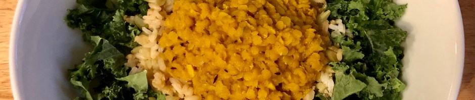 Red lentils are quick cooking so the dish is ready in about 15 minutes. We serve ours with kale in the bottom of the bowl, then rice or in my case a rice and riced cauliflower mix, and then the lentils. Garnish with a squeeze of lemon and if you like a squirt of sriracha and some sprigs of cilantro.