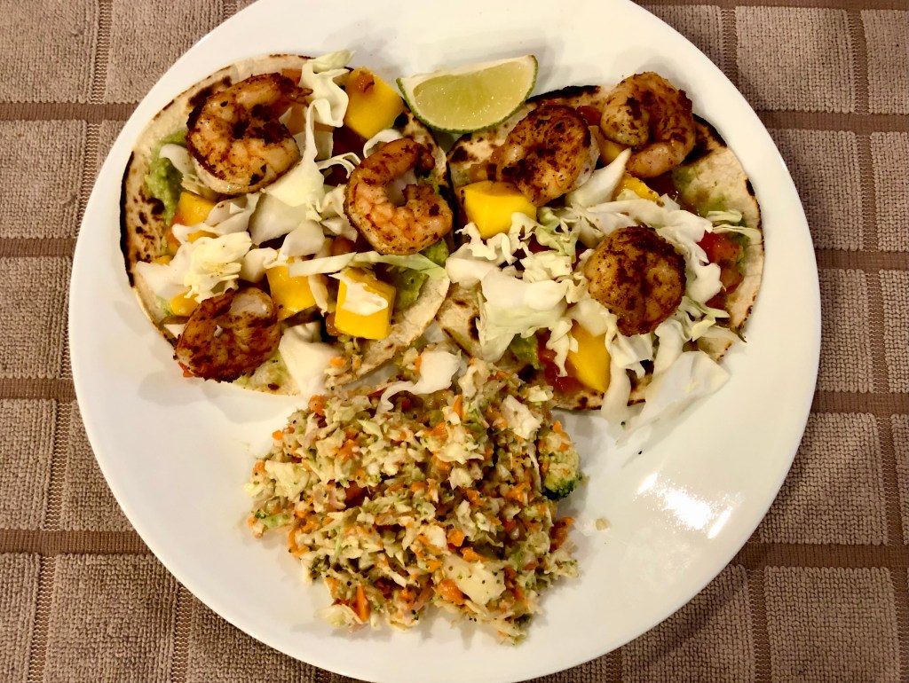 Tonight’s dinner was a big success. The combination of guacamole and tomato/mango salsa went really well with the shrimp. In addition the slaw made of chopped cabbage and broccoli (same family) with some sweetness from carrots and the zing of pickled onions (leftover from Monday) plus some of their juice and mayonnaise was a real winner.