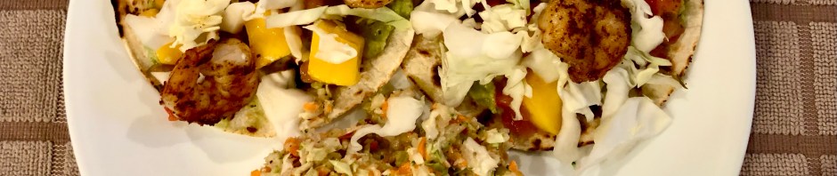 Tonight’s dinner was a big success. The combination of guacamole and tomato/mango salsa went really well with the shrimp. In addition the slaw made of chopped cabbage and broccoli (same family) with some sweetness from carrots and the zing of pickled onions (leftover from Monday) plus some of their juice and mayonnaise was a real winner.