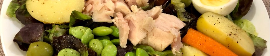This is my take on the French salad from Nice. I replaced the green beans with edamame and added carrots because John wanted carrots and artichoke hearts because I wanted them. Otherwise it’s a pretty true representation—salad greens, potatoes, canned tuna, tomatoes, hard boiled eggs, and olives dressed with olive oil and white wine vinegar.
