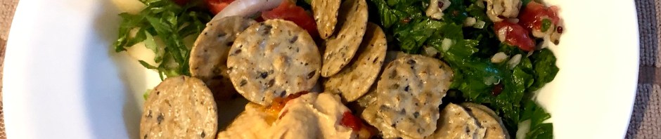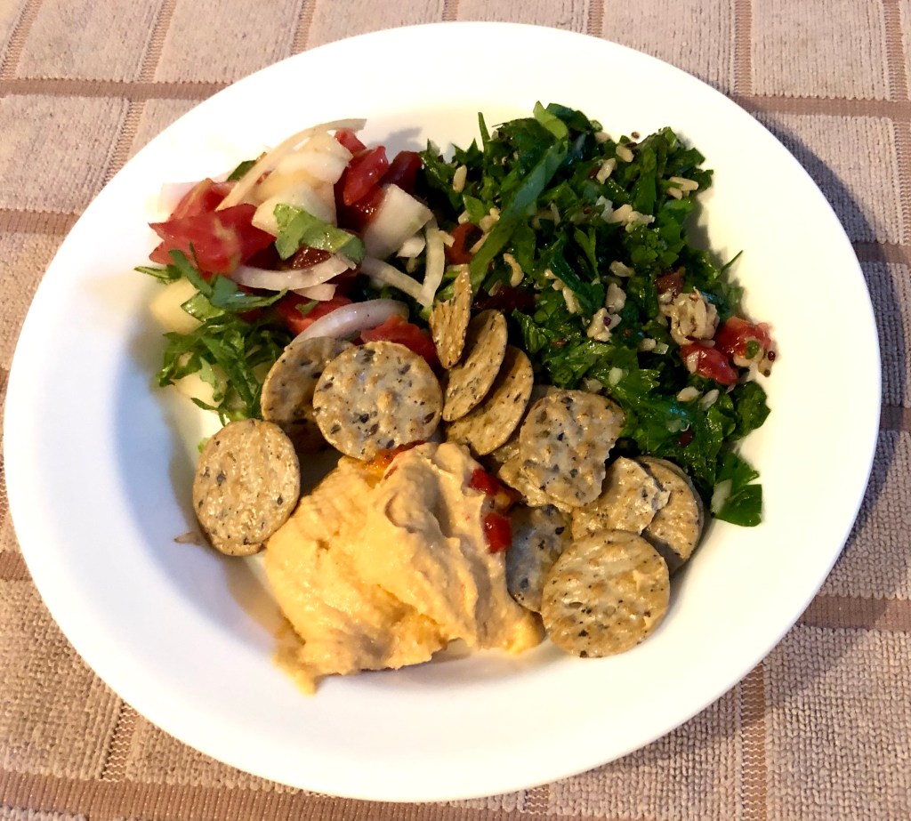 Tonight’s installment of what-to-make-for-dinner-when-it’s-hot is a combo of store-bought hummus and crackers plus a couple of homemade salads. The tabbouleh is parsley, tomatoes, some sort of grain and a lemony vinaigrette. My daughter offered to help me make it and took care of all the prep on the parsley. (It is really the most tedious part!) The cucumber and tomato salad were produce that came from her plot at the community garden!