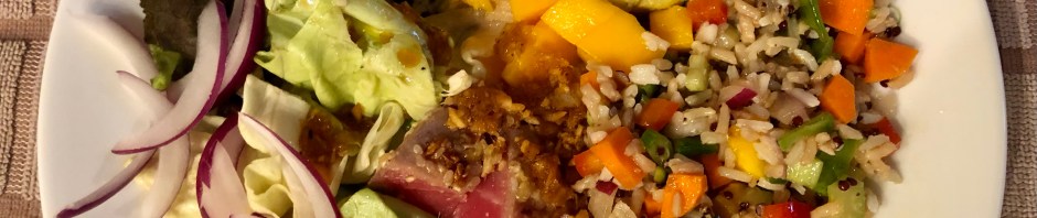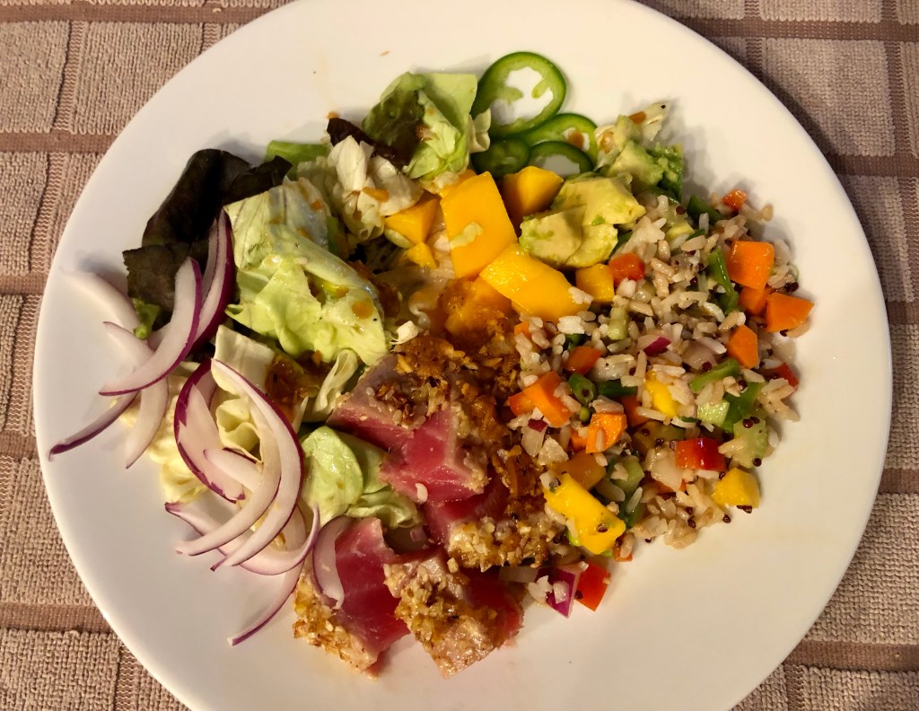 In addition I made the Asian rice salad from a recipe I found at “The Spruce Eats” https://www.thespruceeats.com/cold-asian-rice-salad-with-veggies-3377789. Much like John I cut the amount of oil. I used less sugar as well. At some point I just kept tasting the dressing adding a little more sesame oil, a little more vinegar, and then a dash of soy sauce. I also put in some minced jalapeño for a little zing and chopped mango for sweetness.