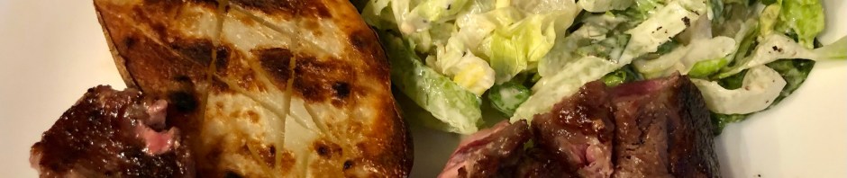 For my part I microwaved a split russet potato and the handed it off to John for some searing on the grill. I also made a Caesar salad kit.