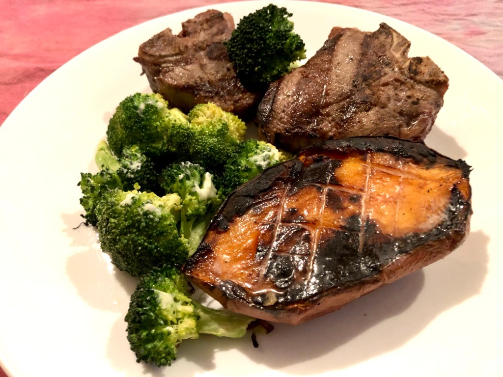 While I was busy microwaving the sweet potato and broccoli so they would be ready to be merely seared, John heated up the grill and put the lamb chops on. It did not take long for him to cook the lamb plus sear the sweet potato and broccoli. The lamb came out rosy pink and the sides were yummy. In the contest of who got the lamb bones picked clean of all meat John was the winner with our daughter coming in second, and I was last. Nonetheless a tasty dinner was enjoyed by all!