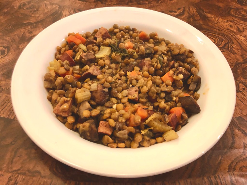 After sautéing the mushrooms, onions, and garlic with the cut up pieces of turkey sausage we added carrots and celery, a cup of picked over and rinsed lentils, and 4 cups of chicken broth plus a bay leaf. Salt and pepper is a given as always. The combination cooked at a simmer for 45 minutes.