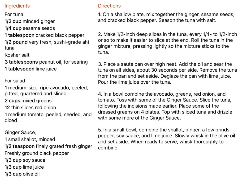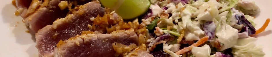 This is such an easy but delicious recipe to make. I found it on the Food Network site. John coated the tuna according to the recipe and seared it quickly. I took a shortcut on the salad using prepackaged greens. The ginger dressing was easy to make with my mini food processor. It does such a great job with mincing ginger and shallots (or onion.)